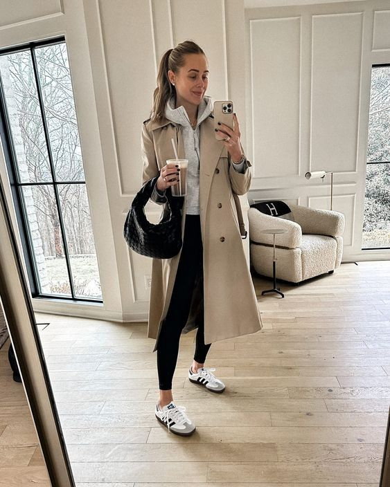 This look feels classic and timeless. It’s also practical for transitional weather when temperatures change throughout the day.