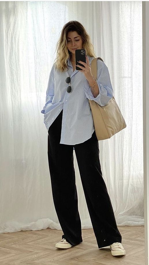 Or you could wear the shirt slightly open over a tank top. This creates a relaxed and modern outfit that works well for everyday wear.